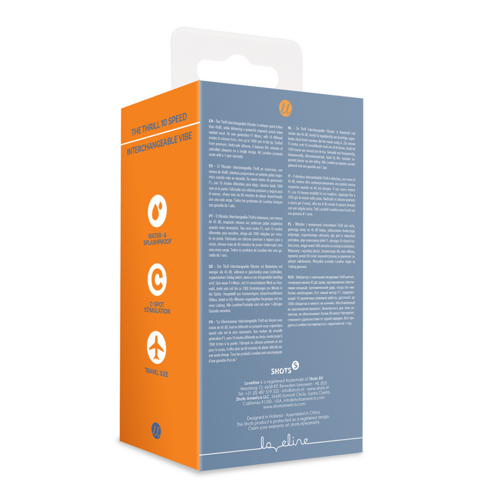 De Thrill Interchangeable Vibrator is fluisterstil met minder dan 45 dB, terwijl hij tegelijkertijd een krachtige, orgastische stoot levert wanneer dat het meest nodig is. Zijn nieuwe F1-motor, met 10 verschillende modi om uit te kiezen, draait tot 7000 toeren per minuut aan de top. Gemaakt van hoogwaardig, lichaamsveilig siliconenmateriaal, biedt hij 60+ minuten ongeremd plezier op één lading. Alle Loveline-producten worden geleverd met een garantie van 1 jaar.